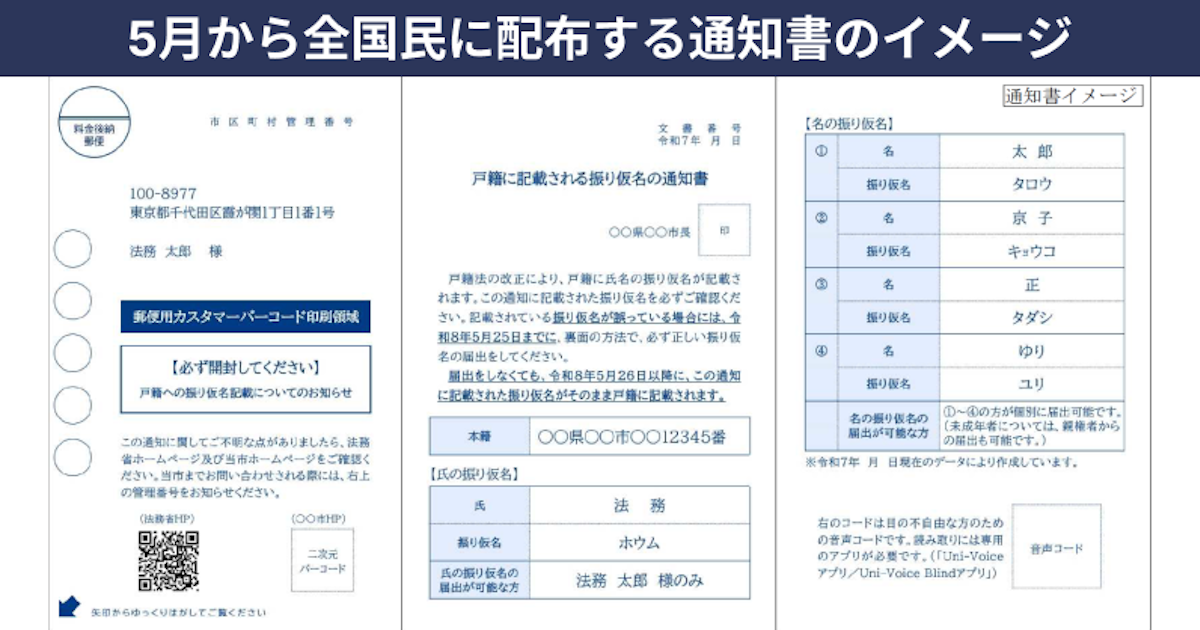 法務省は22日、戸籍に記載する氏名の「読み仮名」の通知書を公表した。5月以降、本籍地のある市区町村から全国民向けに郵送す…